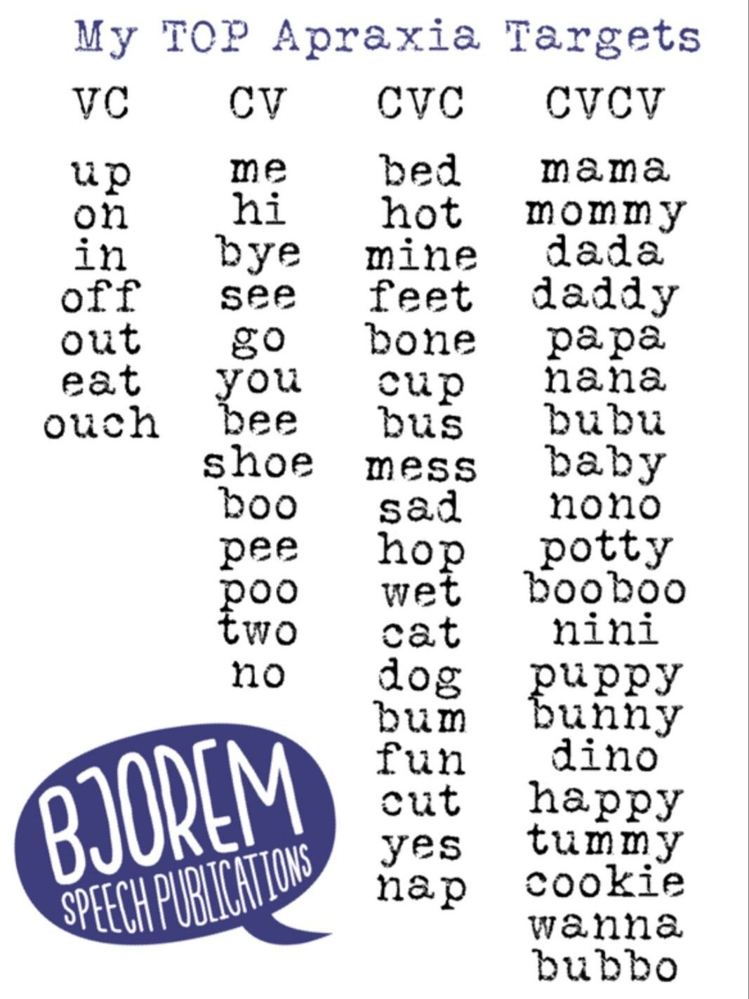 This word list from Bjorem Speech is not just for apraxia! It is perfect to print out, and hang on the fridge for those little ones who are having a tough time getting their motor going.